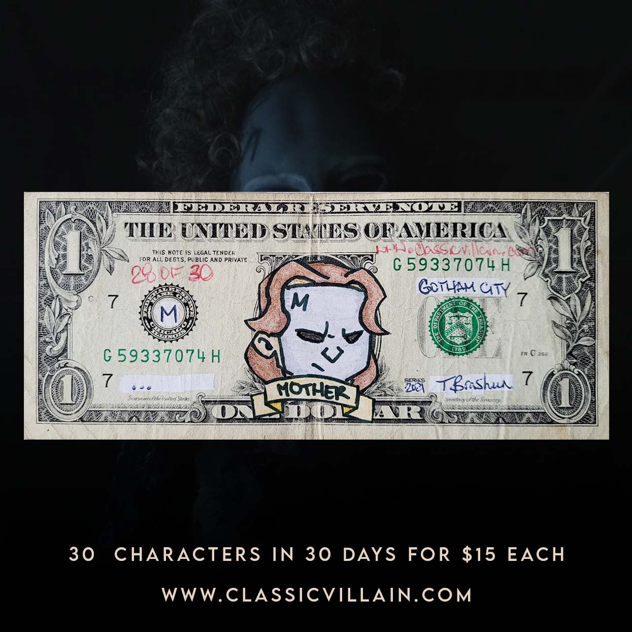 Limited to 1, this character is taken from the Batman comics, cartoons and TV shows and drawn on regular print paper then colored in using RoseArt markers and color pencils and placed on real United States legal tender $1 dollar bills. Each dollar is then modified from its original design with the originating city being changed as well as the signatures on it. Each dollar is numbered to authenticate where it was created in this series of 30 original pieces. Grab it today before its gone.